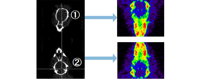 PET(ポジトロン断層撮像法、Positron Emission Tomography)イメージングは、放射性同位元素(RI)で標識した薬剤を生体内に投与し、体外からカメラで撮像することで、放射性薬剤の生体内での分布状況を画像化する技術です。 生体内の薬物動態を可視化するPETイメージングは創薬研究に有用なツールです。近年、医薬品の研究開発において、開発候補化合物の薬効や、臓器や細胞などへの取り込みが、想定されたものになっているか確認する手法として、分子イメージングが注目されています。中でも、すでにがんや脳機能の診断に使用されているPETによる分子イメージング(PETイメージング)は、開発候補化合物の代謝過程の評価や、バイオマーカーとして病態の確定や治療効果の判定ができる手法として期待されています。